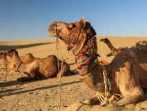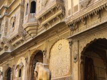 Jaisalmer wurde 1156 geründet und galt als Hauptstadt des indischen Fürstenstaats Jaisalmer. 1818 fiel die Stadt in die Hände der Briten, bis die Indische Union entstand und die Herrschaft aufgelöst wurde. Jaisalmer liegt zusammen mit seinem Herzen, dem mittelalterlichen Fort, westlich am Rande der Thar Wüste an der Grenze zu Pakistan. Warum die Stadt die Goldene Stadt genannt wird, wurde uns schnell klar. Der gelbe Sand und der gelbe Sandstein, aus dem die Stadt erbaut wurde, verleiht dieser und ihrer Umgebung eine goldgelbe Färbung. Jaisalmer ist mit seiner mittelalterlichen Festung zum Weltkulturerbe ernannt worden.