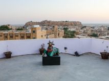 Ein Glück, dass das Tuk Tuk mit unserem schweren Gepäck durch die engen Gassen des Fords passte, mit einem größeren Transportmittel hätten wir es nicht bis zum Hotel geschafft. Im Himmat Niwas Hotel angekommen, begrüßte uns ein junger Mitarbeiter an der Rezeption und bat uns noch ein Weilchen zu warten. Das Frühstücksrestaurant auf der Dachterrasse öffnet in einer halben Stunde, meinte er. Wir waren ziemlich müde von der anstrengenden Nachtfahrt, am liebsten wären wir gleich auf unser Zimmer gegangen. Doch Stopp, wir bekamen gar kein Zimmer für diesen Tag, weil uns eine Wüstensafari mit Übernachtung bevorstand.