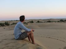 Danach zog es uns zum Fotografieren auf die Dünen, denn der Sonnenuntergang kündigte sich an. Tracy predigte uns am Morgen extra noch, dass dieser sehr schnell vorbeigeht und wir vorher überlegen sollten, was wir für Posen machen wollen. Als wir auf den Dünen saßen und lustige Figuren mit unseren Körpern machten, kamen aus dem Nichts drei Hunde und legten sich zu uns.