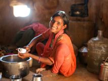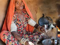 Gerne hätten Karen und Xenia noch länger mit den Kindern und dem süßen Baby gespielt, doch wir wurden zum Chai trinken, in die Küche von Camels Mutter gerufen. Sie sprach mit uns indisch, was wir natürlich fabelhaft verstanden und reichte uns die heißen Chai´s herüber. Wir alle saßen in der Hütte, weil sie zum Stehen zu nieder war. Es ist hier üblich, auf dem Boden zu speisen. Immer wieder kam eine Ziege hereinspazierte, doch sie wurde von Camels Schwester jedes Mal vertrieben. Seine 12-jährige Schwester gesellte sich zu uns und wechselte ein paar Worte in Englisch mit uns. Sie war ein sehr freundliches und neugieriges Mädchen. Xenia schenkte ihr zum Abschied noch einen Armreifen, sie war so dankbar darüber, dass sie für Karen und Xenia ihre Haarspangen opferte. Sie wollte diese eigentlich gar nicht, durften sie aber nicht ablehnen. Dankend nahmen sie die Spange entgegen und schlenderten voller bunter Eindrücke zu den Kamelen, wo Camels Vater, Camel, Matt und Stefan bereits sehnsüchtig auf die Frauen warteten, die natürlich noch mit ihrer Kamera beschäftigt waren.