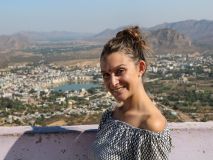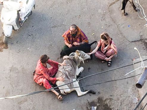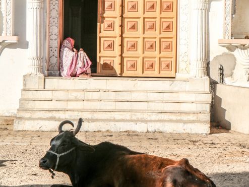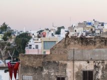 Zum Sonnenaufgang ging Xenia auf die Dachterrasse, denn sie hatte zuvor gesehen, dass es da einen kleinen Turm gab, von dort aus hatte man bestimmt den besten Blick über Pushkar. Das war in der Tat so, nur die Wendeltreppe nach oben, wackelte so sehr, als würde sie jeden Moment umfallen. Von oben gab es vieles zu entdecken, die vielen Hügel, welche die Stadt umschließen, geschmückte Straßen, prächtige Tempel und Ziegen die auf den Dachterrassen hausten. Flinke Affen (Leguren), sprangen von Haus zu Haus, um sich etwas Leckeres zu erbeuten. Aber sonst war noch keiner wach, die Menschen schienen noch zu schlafen. Das fühlte sich auf einmal so entspannt an, ja Indien besitzt sogar Orte und Uhrzeiten, die es einem zulassen zur Ruhe zu kommen.