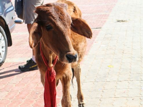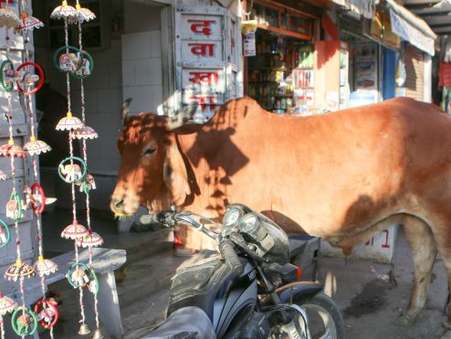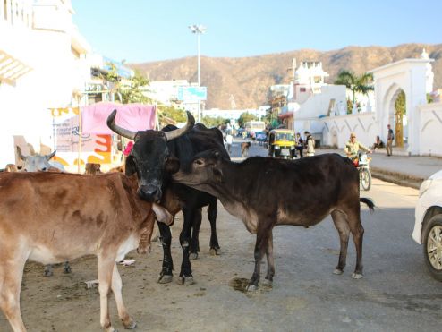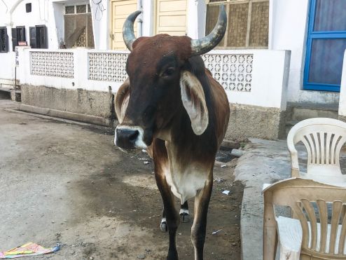 Es war so weit, wir waren bereit für das spirituelle Pushkar. Wir liefen die Straßen entlang, die wie immer voll von Kühen und bunt angezogenen Menschen waren, die uns ein Lächeln schenkten. Am heiligen See angekommen, konnten wir beobachten wie sich die Menschen zum Reinwaschen versammelten. Natürlich waren hier wieder zahlreiche Kühe vertreten, welche die Opfergaben (Blumenkränze/Ketten) verspeisten. Ein Mann kam zu uns und bat uns die Schuhe auszuziehen, denn es handelt sich um einen heiligen Ort. Wir gingen also Barfuß den See entlang, bis uns der Weg hinaus aus der Stadt führte. Dort entdeckten wir Kamele und Kameltouren, die angeboten werden. „Kaum zu glauben“ in Pushkar befindet sich der größte Kamelmarkt der Welt. Der Kamelmarkt findet alljährlich als großen Volksfest, während des Vollmonds im Hindu-Monat Kartik statt und fällt entweder in den Oktober oder November. Fünf Tage lang scharen sich bis zu einer halben Million Besucher in die kleine Wüstenstadt und bewundern die Zehntausende rasierten und kunterbunt geschmückten Kamele. Warum die Kamele so aufgebrezelt werden? Weil es einen Schönheitswettbewerb für die Höckertiere gibt. Für Händler, Käufer und Besucher gibt es noch den Schnurrbartlängenwettbewerb, was eine ziemliche Gaudi sein muss. Und nicht zu vergessen, für die sportlichen Kamele findet ein Kamelwettrennen statt. Als wir wieder zurück in die Stadt kamen, die wie ein großer Bazar für uns schien, warteten überall bunte Straßenstände, Menschen, viele Kühe und laute Musik auf uns, eine ziemliche Reizüberflutung. Die Tempel schauten wir uns nur von Außen an, weil eine Menge los war und uns schon die vollen Straßen reichten, durch die wir uns durchschlängeln mussten.