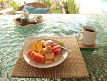 Unser absolutes Happy End in Ubud war unsere Mana Villa. Dort verbrachten wir die letzten beiden Tage unserer Indonesien Reise und ließen es uns gut gehen. Diese 400qm große Unterkunft ist für vier Personen geeignet und hat einen eigenen Pool mit wundervollem Garten. Sie liegt etwa 15 Gehminuten von Ubuds Zentrum entfernt. Jeden Morgen wurden wir mit einem leckeren Frühstück auf der Terrasse überrascht. Währenddessen konnten wir der netten Haushälterin bei ihrem täglichen Ritual dem Puja zu sehen. Sie verteilte an verschiedenen Stellen im Garten, meistens auf einer Art Steinsitz oder Hausaltar, verschiedene Gaben wie Süßigkeiten, Räucherstäbchen und Blumenschmuck um ihre Götter zu ehren. Hier hatten wir einfach unsere Ruhe und konnten uns nochmal so richtig entspannen, bevor wir die Heimreise antraten. Allerdings war es dort so schön, dass wir die Villa gar nicht mehr verlassen wollten.