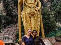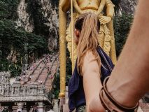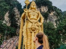 Endlich waren wir bei den Batu Caves angekommen. Diese zählen zu den außergewöhnlichsten und attraktivsten Ausflugszielen in der Region und sind ein Heiligtum für alle Hindus in Malaysia. Bevor es die 272 steilen Treppenstufen hinauf zur Höhle ging, bestaunten wir die knapp 43 Meter hohe Statue des Gottes Murugan. Wir fühlten uns ziemlich klein, als wir neben dieser riesigen Statue standen 😉.