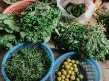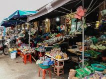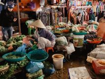 Wir freuten uns schon riesig auf die Cooking Class und wurden pünktlich um 8 Uhr von unserem Koch Vi mit dem Fahrrad abgeholt. Doch bevor es losging, fuhren wir zum lokalen Markt, wo uns Vi zeigte, was so alles verkauft wird. Es gab alle Varianten an Gemüse, Fisch und Fleisch. Kühlkette beim Fleisch wie in Deutschland? Fehlanzeige. Das Fleisch liegt den ganzen Tag ungekühlt und offen auf den Tischen…Bei diesem Anblick kamen Stefan schon Gedanken an ein vegetarisches Leben.