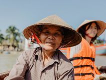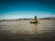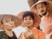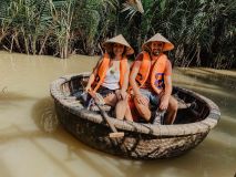 Das Regenwetter war nun vorbei und wir freuten uns über die Sonnenstrahlen. So machte die Fahrradtour gleich viel mehr Spaß. Wir machten uns auf den Weg zur Cam Thanh Coconut Village und welch Überraschung gab es hier eine Kokosnusspalme an der anderen. Noch auf dem Weg zur Village wurden wir von einer Frau angesprochen, ob wir eine Bootstour machen wollen. Da wir das eh vorhatten und die Frau einen netten Eindruck machte, sagten wir zu. Wir konnten unsere Räder bei ihr zu Hause abstellen und gingen direkt zum Boot. Es war ein kleines rundes Bambusboot, mit dem wir über den Fluss schipperten. Es ging vorbei an vielen Kokosnusspalmen, unterwegs bastelte uns die Frau Ringe und Xenia eine Kette aus Bambusblättern. Außerdem bekamen wir noch zu sehen, wie die Fischer ihre Netze auswerfen und eine lustige Tanzeinlage auf einem der Bambusboote.