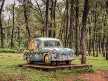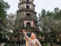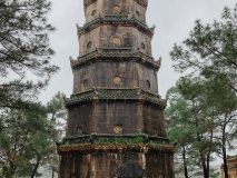 Als erstes ginge es zur Thien Mu Pagode, bei der es sich um ein buddhistisches Kloster am Ufer des Parfüm-Flusses handelt. Mit dem siebenstöckige Phước Duyên-Turm ist es die höchste Pagode Vietnams. Leider hat es geregnet, sodass wir mit unseren Ganzkörperplastikumhängen das Kloster nur kurz angeschaut haben. Zum Schluss sahen wir auf dem Gelände in einer geöffneten Garage noch einen alten Austin, sehr sehenswert.