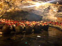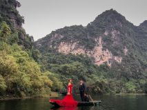 Wir kauften uns Tickets und wurden vor den Booten gefragt, ob wir die 1- oder 2,5-stündige Tour machen wollen. Na ja für den gleichen Preis entschieden wir uns natürlich für die Längere. Gemeinsam mit einem Pärchen aus der Schweiz ging es auf das wackelige Boot, geführt von einer Frau als Ruderin. Die Beiden sind erst vor kurzem in Vietnam angekommen und waren, wie wir, mit dem Wetter nicht ganz glücklich. Auf dem Boot war es recht frisch. Nichtsdestotrotz waren wir umgeben von einer herrlichen Landschaft. Der Fluss schlängelt sich durch die vielen Felsen und sogar unter ihnen hindurch, durch teilweise sehr flache und enge Höhlen. Das war sehr spannend, manchmal wurde es so eng, dass selbst Kopfeinziehen nichts mehr half und wir uns mit den Händen an dem Felsen abstoßen mussten. Außerdem haben wir zwei Stopps bei Tempeln und Pagoden eingelegt, war zwar nicht sonderlich sehenswert, aber eine willkommene Abwechslung vom Ducken im Boot 😉. Als fünf Vietnamesen an uns vorbeifuhren, fragten sie, wo wir herkommen. „Germany and Switzerland“ riefen wir. Ahh ok „Germany and Sweden“ riefen sie zurück :D. Das sind sie gewohnt, meinten die beiden Schweizer, aus Switzerland wird meist Sweden… Unterwegs sahen wir noch zwei Brautpaare, die ihre Hochzeitsfotos auf dem Boot im Wasser schossen. Die Fotos werden hier übrigens nicht nach, sondern vor der Hochzeit aufgenommen. Die Bootsfahrt hat Spaß gemacht, vor allem mit der wunderschönen Landschaft. Leider war es bewölkt und kalt, wodurch wir die Fahrt gerad am Schluss nicht mehr so genießen konnten.