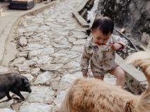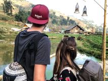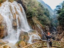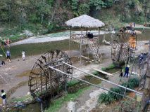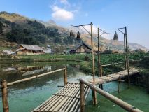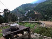 Nach dem Anstieg ging es hinab zur Cat Cat Village. Vorbei an kleinen Geschäften, die meist ihre handgefertigten Taschen und Kleider verkauften. Begleitet wurden wir immer wieder von Schweinen, die hier frei herumliefen. Am Fotopunkt „Cat Cat Village“ knipsten wir natürlich ein paar Bilder, bevor wir hinab zum Tien Sa Wasserfall liefen. Dieser war schön anzuschauen, ebenfalls gefiel uns das kleine Dorf drum herum sehr gut. Kleine alte Holzhütten und entlang des Baches beobachteten wir, wie Kinder im Wasser spielten. Es gab Wasserräder sowie eine Holzschaukel für Kinder, die einem Wasserrad ähnelte. Wir genossen den Spaziergang zurück zur Cat Cat Village, von wo aus wir ein Taxi zurück nach Sapa nahmen.
