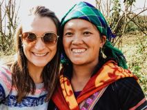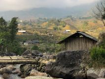 Wir wurden morgens direkt im Hotel von unserm Guide zur Trekking Tour abgeholt. Insgesamt waren wir eine Gruppe von neun Personen, ein Guide und fünf einheimische Hmong Frauen. Sie trugen eine traditionelle Tracht mit vielen Stickereien und Bambuskörbe auf dem Rücken. Eine Frau hatte sogar ihr Kind auf dem Rücken. Die Frauen liefen alle mit Badelatschen, worüber wir bereits nach wenigen Minuten staunten. Der Weg war matschig, rutschig und teils stark abschüssig, wir waren jedenfalls froh über unsere Wanderschuhe. Eine Japanerin hat sich in dem Matsch auch direkt auf den Hosenboden gesetzt. Wir liefen von Sapa aus los, bereits nach wenigen Metern hatten wir eine wunderschöne Aussicht über die Reisfelder hinunter ins Tal. Der Wettergott war auf unserer Seite, denn in Sapa kann es zu dieser Zeit schon mal um die 0 Grad haben, wir hatten Sonnenschein bei 20 Grad – Es war traumhaft. Die Wanderung war teilweise anspruchsvoll, gerade wenn es steil bergab über rutschige Steine ging. Wir liefen meist bergab, zwischendurch gab es auch ein paar Anstiege. Die Frauen waren sehr nett, unterhielten sich mit uns und halfen auch immer wieder bei steilen, rutschigen abstiegen. Beim Mittagessen verabschiedeten sie sich, aber natürlich nicht ohne ihre handgemachten Taschen und Armbänder verkaufen zu wollen. So schön die Wanderung mit den Frauen war, die wirklich sehr nett waren und Xenia bei steilen Abschnitten geholfen haben, so nervig waren sie jetzt. Sehr aufdringlich, auch nach einem klaren nein, wollten sie was verkaufen. Wir gaben einer der Frauen Geld, aber ohne etwas zu kaufen. Da sie sehr nett war, ist das für uns auch in Ordnung etwas zu geben, aber dieses aufdringliche Verkaufen mögen wir gar nicht.